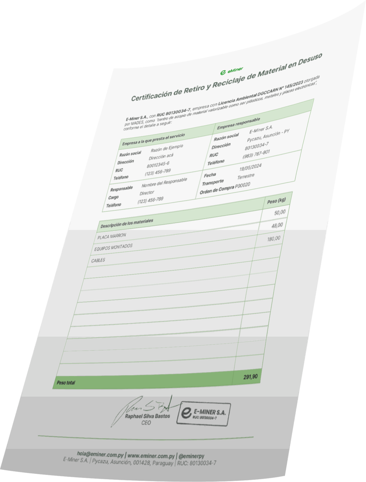 Entre abril y septiembre de 2024, eMiner adquirió con éxito cerca de 60 toneladas de residuos electrónicos únicamente en la capital de Paraguay, Asunción. Este hito destaca nuestro creciente impacto en la región y nuestro compromiso con la gestión de los desafíos que plantea la basura electrónica. Al trabajar activamente con las comunidades locales, empresas y nuestra red de recicladores y distribuidores certificados, seguimos ampliando nuestras operaciones para recolectar y gestionar de manera responsable grandes volúmenes de residuos electrónicos, consolidando aún más nuestro papel como un actor clave en la gestión sostenible de residuos en todo Paraguay.